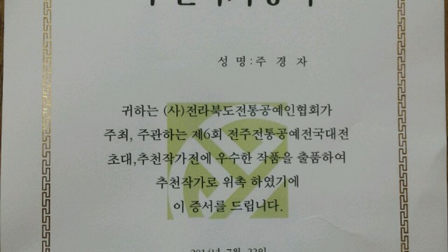 작품활동을 열심히 하다보니 추천작가증서 취득을 하였습니다.