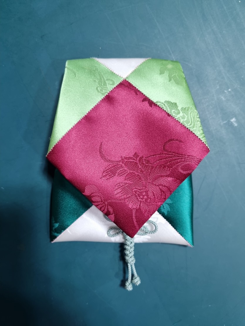 약을 넣어 휴대하는 실용적인 주머니이지만 장식을 위해 달기도 하였고, 조각을 연결하여 직사각형의 모양을 접어 만들기 때문에
