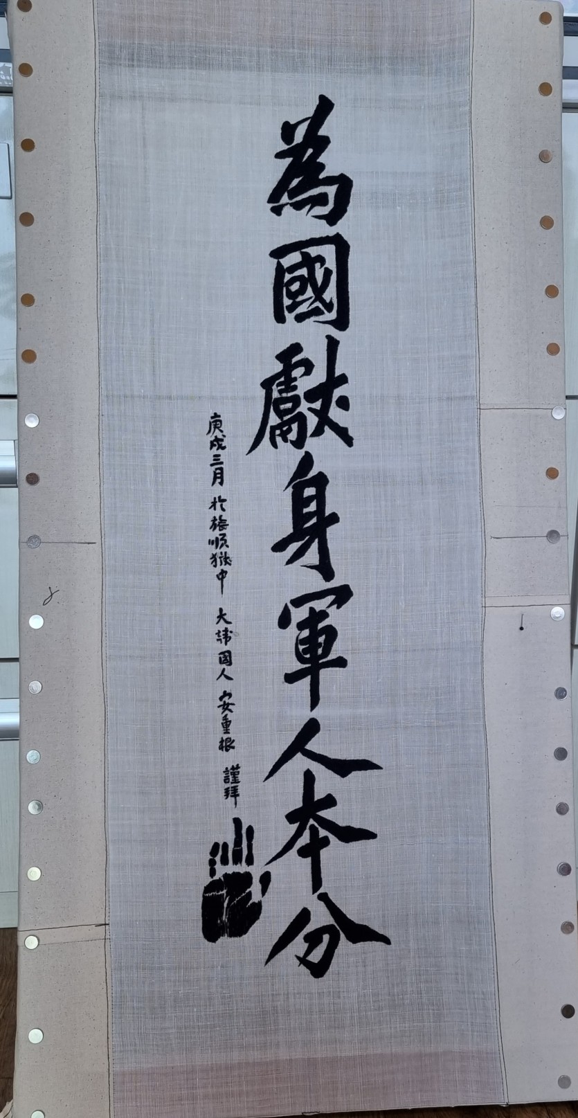 안중근의사의 유묵을 자수로 표현하여 액자를 만들었다