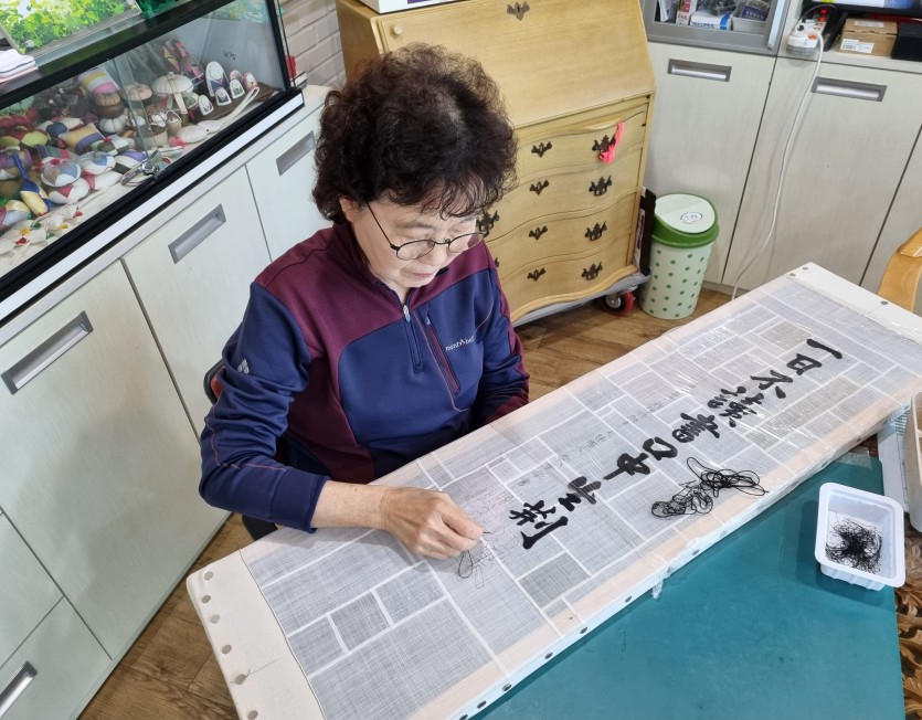 遺墨을  자수로 놓아 족자 제작한 작품들과 직접 수놓는 장면