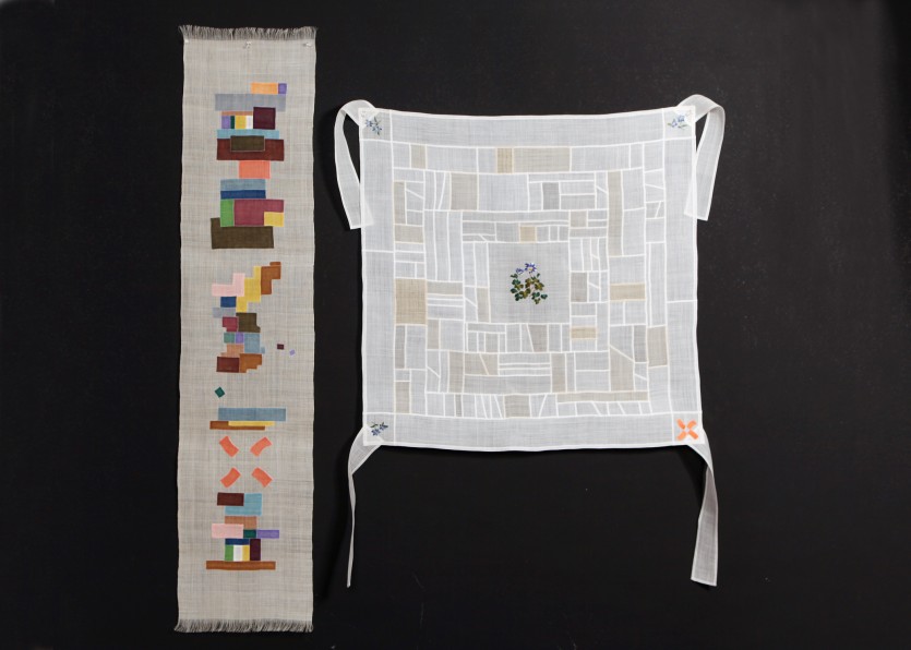 모시에 면실로 들꽃수를 놓아 쌈솔조각보를 만들다.