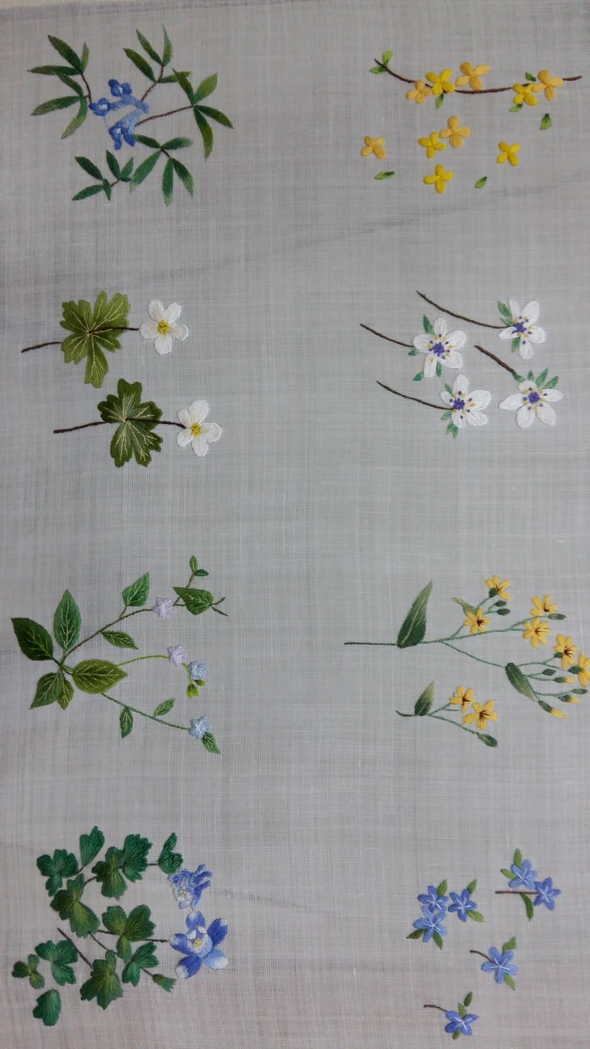 모시에 면실로 들꽃수를 놓아 쌈솔조각보를 만들다.