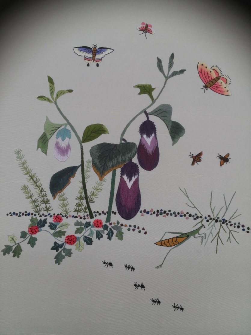 모시에 면실로 들꽃수를 놓아 쌈솔조각보를 만들다.