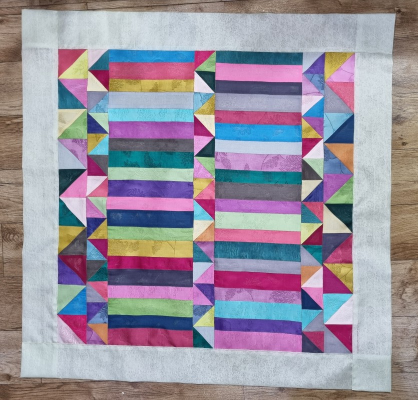 사선과 직선으로 연결하여 단조로움을 피하고 사(숙고사)의 얇고 가벼운 느낌을 살려 보는 이들의 시선을 잡아내는 특수성을 살렸다.