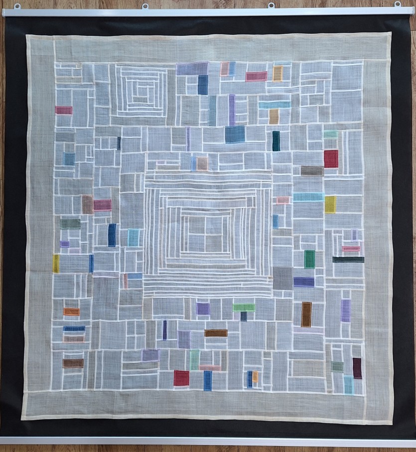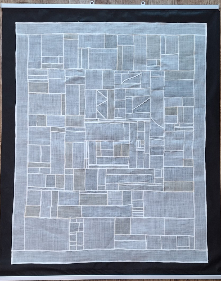 자투리천들의 크고 작은 염색모시와 백모시, 생저등을 섞어서 쌈솔바느질을 하여 화합의 한 장면으로 만들어진 작품