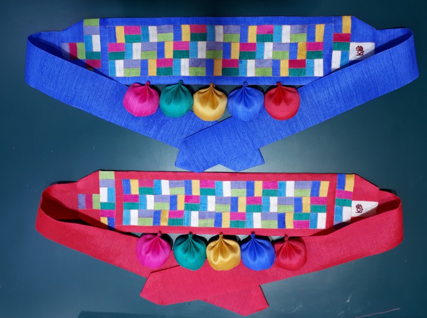 띠의 아랫단 끝쪽에는 五方色 주머니를 달아 장식하였다.