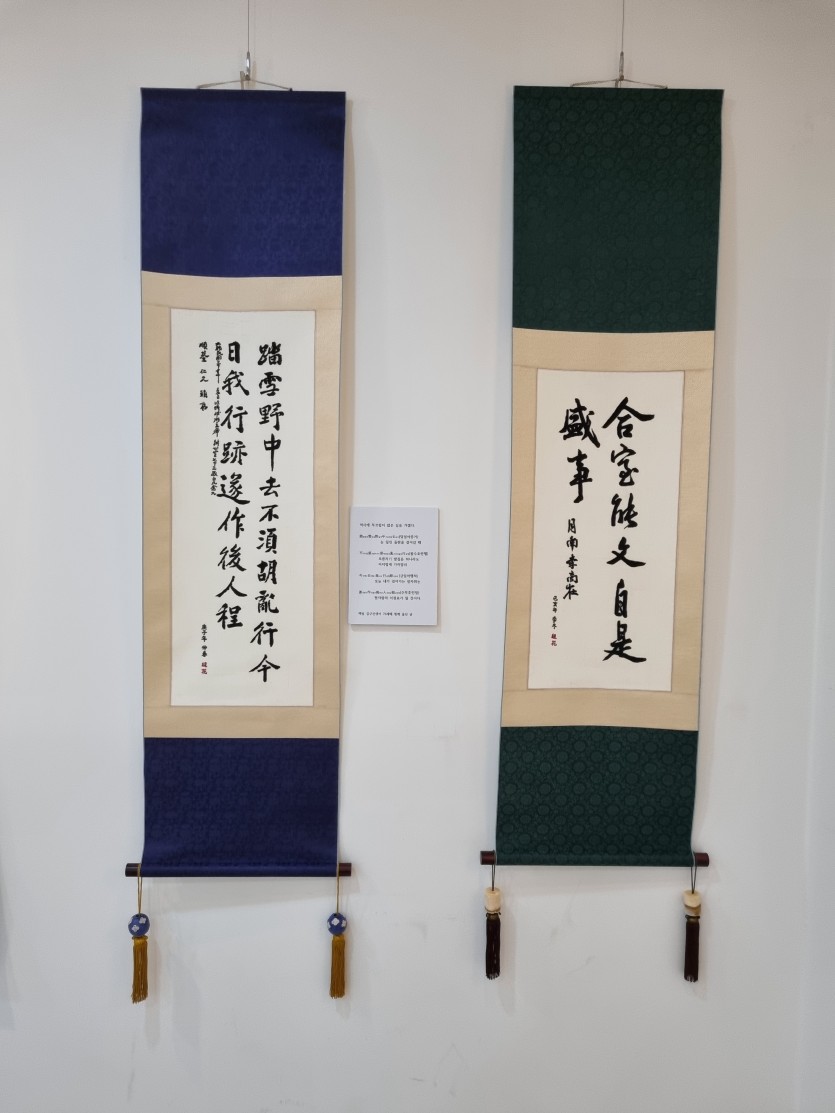 여섯번째 사진은 김구선생님의 친필을 탁본하여 전통기법으로 자수를 놓은 족자 입니다.(답설야중거 불수호란행 금일아행적 수작후인정)