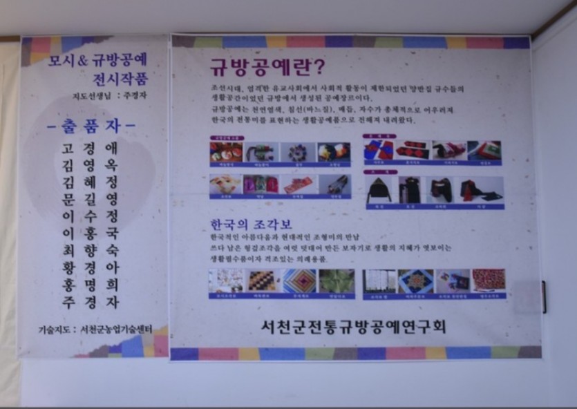 이번 작품전을 준비한 서천군 전통규방공예연구회는 우리나라 최초 쌈솔 명인 주경자 선생님이 전담강사를 맡아 전통규방공예 이론과 제작 기술을 전수하고 있는데 특히 서천 모시를 활용한 다양한 기술교육을 함께 진행해 교육생들의 호응이 대단하다고 합니다.