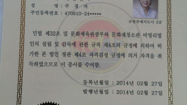 2014. 2. 27 규방공예 자격증을 취득 하였습니다.